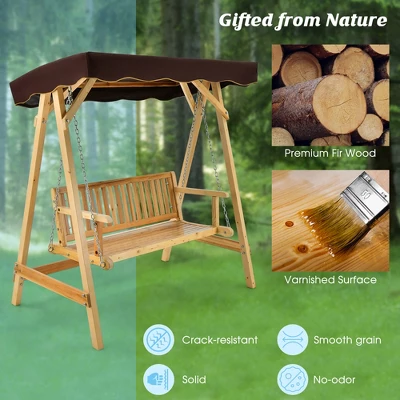 Looking for a casual yet beautiful addition to your patio? This outdoor swing chair is made of fir wood with beautiful grain and natural color that will be a charming addition to your patio. In addition, the varnish-protected surface is not easily eroded by rain and can be used outdoors for a long time. What’s more, this swing chair has a weather-resistant canopy with adjustable tilt angle to block rain and sunlight from different directions for you. The wide seat has a tilting backrest and armrests, dedicated to providing you with a comfortable sitting experience. In addition, two metal chains can be adjusted in length as needed to meet the habits and needs of different people. Moreover, the metal chains and the A-shaped structure on the side make our swing chair solid and sturdy enough, not easy to shake and fall apart, so two adults can sit and relax and chat or enjoy the view without worry.