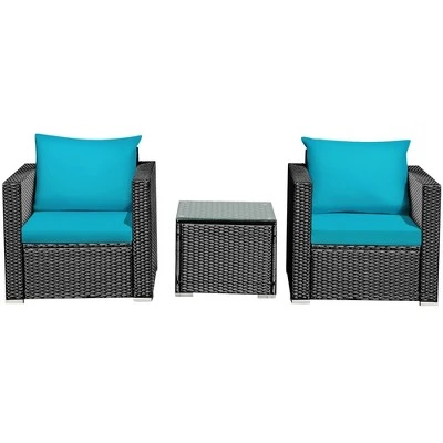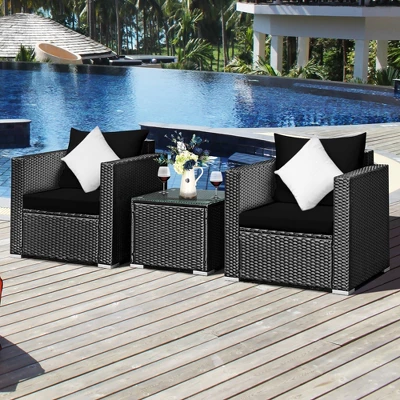 Do you want to drink coffee or have a break with your friend in your garden, patio or yard? Have you found suitable sofa set? Our 3-piece outdoor rattan furniture set is a good choice for you. Made of sturdy steel and premium rattan, the sofa set is sturdy and durable which can be used for long time. Comes with a tempered glass top table, not only can you place some drinks or snacks on hard tabletop to take conveniently but also some decors like vase can be put on the tabletop. The sofas are equipped with back and seat cushion which will give you excellent comfort. And the cover of cushion has zipper for removing and rinsing easily. It’s perfect to relax and enjoy time with your friends and family.