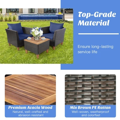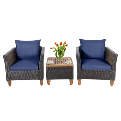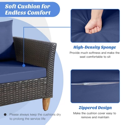 Strong metal frame has rust-resistance and high strength functions, giving you enough security. Made of premium acacia wood, the legs of 3 pieces and the tabletop are sturdy and built-to-last. The back cushions and seat cushions, which padded with thick sponges, are comfortable and soft, offering you wonderful sitting experience. They are easy to maintain that you can remove the covers of cushions by unzipping when they need to be cleaned. The rattan sofa set perfectly suits a variety of indoor and outdoor occasions, such as balcony, yard, patio and so on. What are you waiting for? Our 3-piece sofa set is perfect for you!