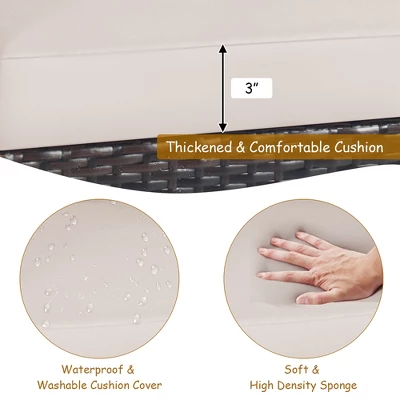 - Upgraded Comfortwith Thick Cushion:This rattan furniture set chair has a large-sized seat and a wide backrest, so that you can relax your body and relieve the fatigue of the day. Most importantly, we will also provide soft and thick cushions, these removable and washable cushions provide ultimate comfort to your back and hip.