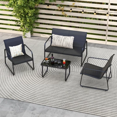 Enjoy wonderful afternoon tea time with our 4-piece patio furniture set!This outdoor furniture set is perfect for most patio places such as the backyard, porch, balcony, and poolside. Only taking a few minutes to assemble, you can sit on the well-designed armchairs to fully relieve yourself. And the superior breathable fabric would strongly support your body while the solid metal frame provides credible stability. Additionally, the functional coffee table has a tempered glass top, which is firm to support your items.