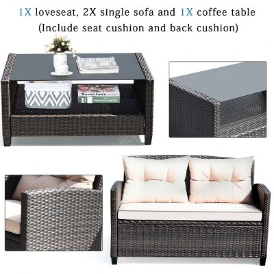 - 4-Piece Rattan Patio Furniture Set: This set of rattan sofa consists of two single sofas, one loveseat and a tea table with black transparent toughened glass countertop. The exquisite rattan weaving craft makes the product reveal elegant flavor in modern design. It is suitable for most decoration styles and adds fashionable flavor to your garden.
