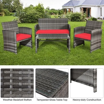 Rattan patio set includes one loveseat, two single chairs and one coffee table.