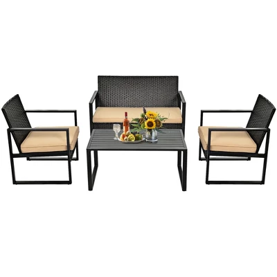 Do you want to have a private corner in your garden or patio? Our 4-piece furniture set is a good choice for you. The sofa set is made of sturdy steel and wicker, which ensures incredible durability and offers a beautifully textured look for long time. The single sofa and loveseat with ergonomic body-hugging curve provide excellent comfort for you. Besides, the single chairs and loveseat are equipped with soft and high-resilient cushion for seat. And the feet of sofa set can be adjust slightly to accommodate for uneven ground. With concise style, the set can be placed both in outdoor and indoor to be a good décor.