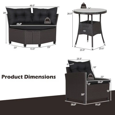 - 3-Package Delivery: The whole patio set will be delivered in 3 packages so the arriving time may vary. And box 1 includes all the installing accessories you need. Moreover, with the helpful instruction, you can correctly finish the assembly without too much effort. Dimension of middle sofa: 49.5” x 23” x 29” (L x W x H). Dimension of each side sofa: 31.5” x 25.5” x 29” (L x W x H). Dimension of coffee table: 24” x 26.5” (Dia x H).