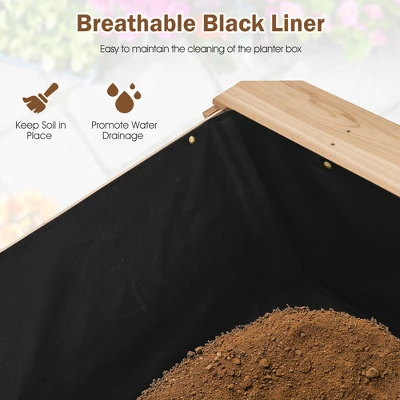 - Built-in Liner & Drain Hole: This wooden planter is designed with drainage holes to avoid excess water damaging the healthy growth of the plant roots. And the raised garden bed comes with a breathable black liner that separates the wood from the soil well,ensuring a clean plant stand and also allowing better water run-off.