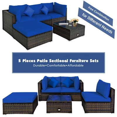Are you waiting for a proper rattan chair set to spend the leisure time? Sturdy and solid steel frame with all weather PE rattan can keep stability and durability for long time use. Soft cushions will hold you comfortably and the cover of cushion can be removed with smooth zipper. There is enough space to provide enough sitting space for several people. You can also regard the coffee table as an ottoman by removing the tempered glass top for more sitting space. Featuring with 1 armless sofa, 2 corner sofas, 1 ottoman and 1 coffee table, this patio furniture set can be combined in various ways according to your different needs. Just sit on the sofas and enjoy the sunshine in front of the pool or on the patio with your loved ones.