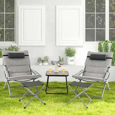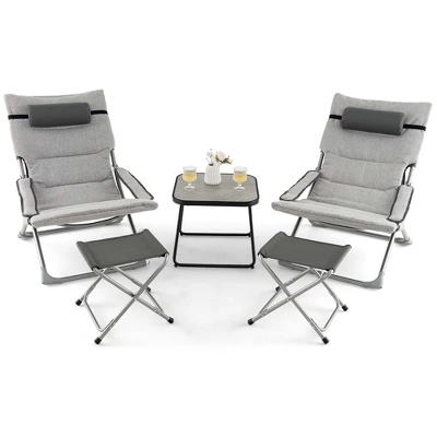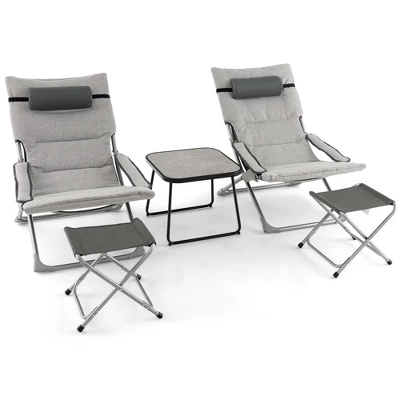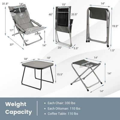 Featuring two folding sling chairs complete with ottomans and a matching coffee table, this set will make you and your friend fully relaxed. The removable seat cushion and headrest combo provides an extra layer of comfort. What’s more, with heavy-duty metal frame, the 5 pieces can withstand strong load. And the folding and portable design allows you to easily store or transport the patio set. Elevate your outdoor lounging experience with this sling chair set!
