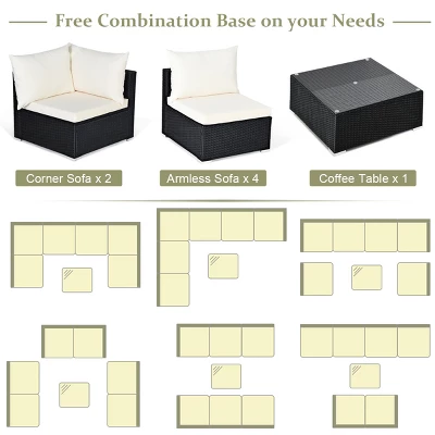 This our 7 pieces outdoor patio table chairs set. It including 2 corner sofa, 4 single sofa and 1 coffee table with glass top. This furniture set Are Of Contemporary Looks And Flavor, Offers Comfortable And Exceptionally Stunning Outdoor Lounging .It Will Be A Great Addition To Any Outdoor Living Space. The Sofa And Chairs Feature Exquisitely Woven Wicker With Gently Slopping Curves And Soft Yet Supportive Cushioning. The Seat Cushions Are Designed To Resist The Elements And Stay Beautiful Through Years Of Use. What is More The Table Features A Tempered Glass Top .It Is Perfect For The Pool Side, Deck Or Patio, These Cushioned Seats Will Let You And Your Guests To Sit Back, Relax And Enjoy The Great Outdoors.