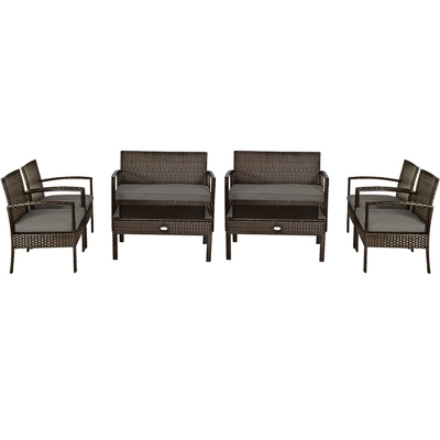 - Dimension of Rattan Furniture Set: The rattan chair set consists of 2 loveseats, 4 single chairs and 2 coffee tables. The size of the single chair: 24” x 21.5” x 30.5” (L x W x H), size of loveseat: 42” X 21.5” X30.5” (L X W X H), size of the coffee table: 34” x 18” x 15” (L x W x H). Weight capacity of loveseat: 790 lbs, weight capacity of single chair: 400 lbs, weight capacity of coffee table: 165 lbs.