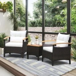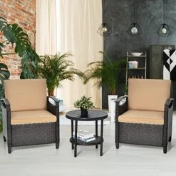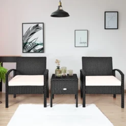 Costway 3PCS Patio Rattan Furniture Set Table & Chairs Set With Thick Cushions Garden