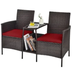 Costway Patiojoy 3PCS Patio Rattan Furniture Set Cushioned Sofas Wood Table Top W/Shelf
