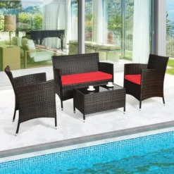 Costway 4PCS Patio Furniture Set Rattan Conversation Set W/ Tempered Glass Coffee Table Cushion Red